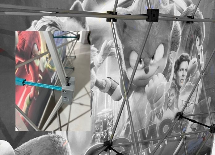 Estructura de aluminio, resistente, ligera y de muy fácil montaje (el soporte y la gráfica se pliegan juntas como una araña).
